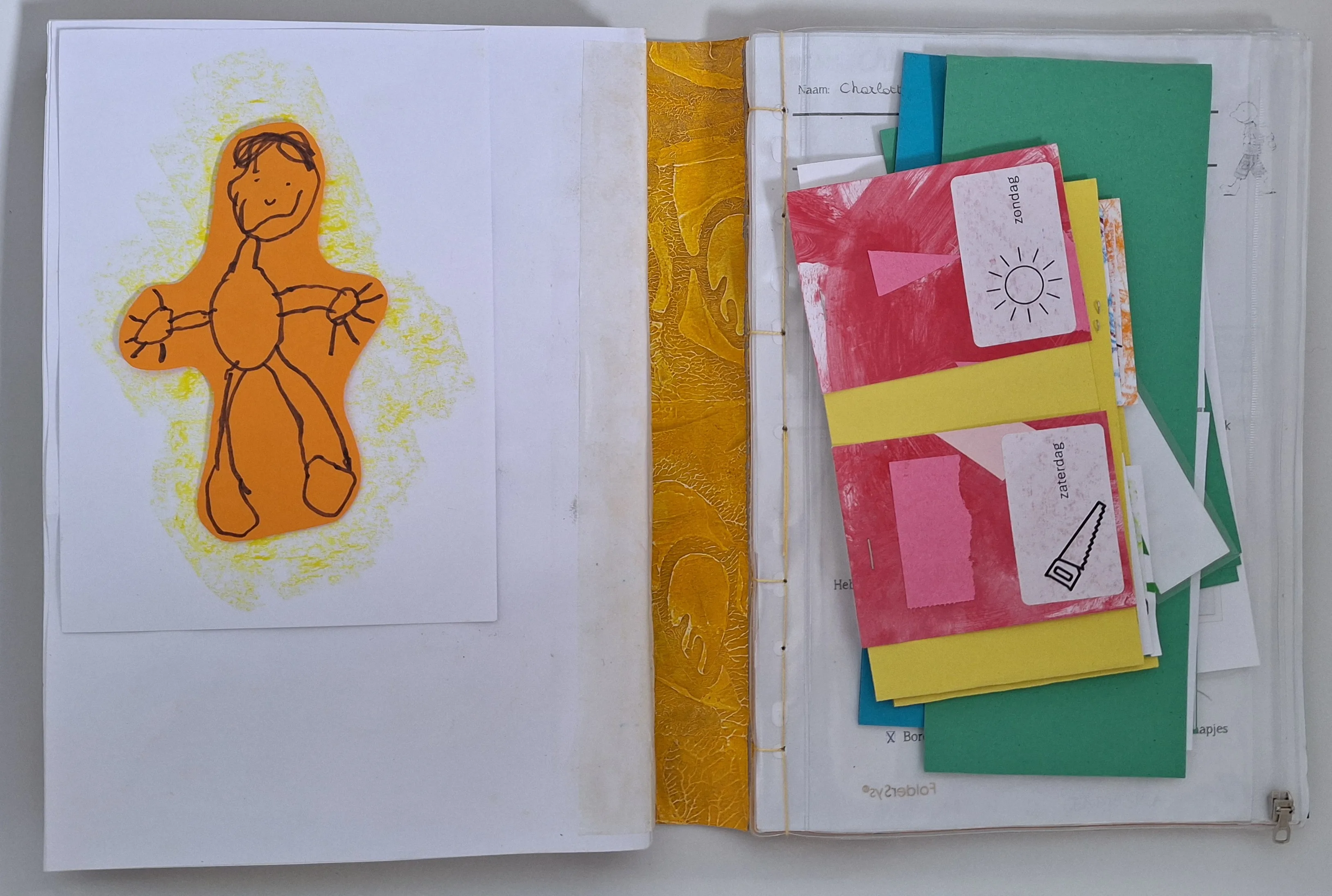 Tekeningen van A4 formaat worden rechts ingebonden zodat je het boek makkelijk kunt doorbladeren en elke tekening goed tot zijn recht komt. Extra handig: bovenop de tekeningen kan een plastieken A4-mapje met ritssluiting worden genaaid voor kleinere knutselwerkjes of klasfoto's.